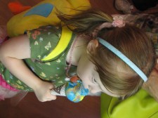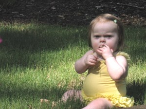 Right around 7pm, The Quail, she does this thing- where she suddenly has had enough of us, no more good cheer, no more smiles, no- it’s fuss, fuss, “Hey someone should have known to get me a bottle two minutes ago!” fuss. We oblige; sneaking an extra ounce of milkshake in for good measure, lay her down in her practically-new- never-been-slept-in-before-by-another-child- and-no-we -didn’t-just-buy-it-in-February-2009-crib; propped just a little bit upright, for good, aspiration-prevention measure, tell her we love her, kiss her forehead, cover her feet in a snuggly blanket, start the bluebirds singing on the ceiling and walk away. That’s it- we just walk away. No crying. No fussing. No protesting. It’s crazy- she drinks her milk and then she GOES TO SLEEP! Have you ever heard of anything so crazy? And then get this- she doesn’t wake up- until between 11-12 hours later! Apparently all this time- the problem was, we were reading What to Expect- rather than letting her read the manual herself! Now this blessing in our life is new. It started upon the completion of molar number 2 making it’s full appearance. That’s toothie number 6. 5 of which have introduced themselves to her in the last 2 months poor lamb. 2 more molars to go- so I know this blessed state is only temporary. When she’s in the middle of meeting a tooth- it’s 3-5 wakings a night- and unhappy, grief wall wailing, gnawing off her fingers inspite of being dosed up on Motrin wakings. It is good to know she can do it. Kathy told her last week in feeding therapy that it was time to say good-bye to the middle of the night bottles. And so she has…for now…